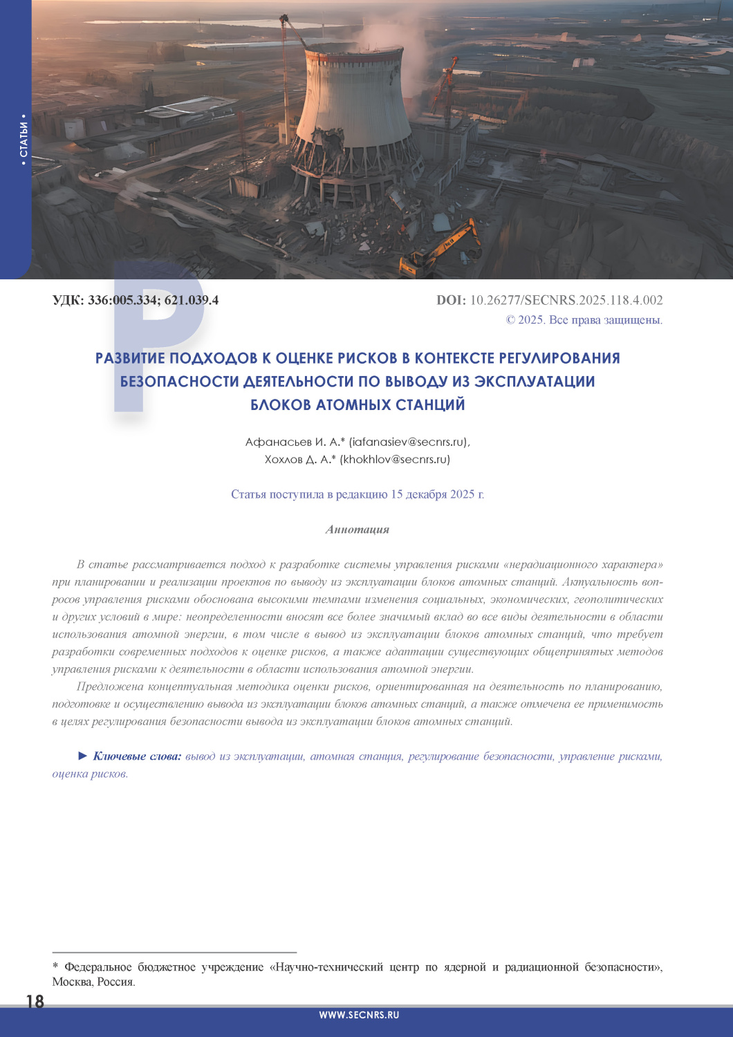 ► Ключевые слова: вывод из эксплуатации, атомная станция, регулирование безопасности, управление рисками, оценка рисков.